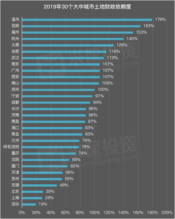 在统计的30个城市中,土地财政依赖度超过50%的有26个,超过100%的城市也多达12个,可见大中城市对土地财政普遍依赖度较高。