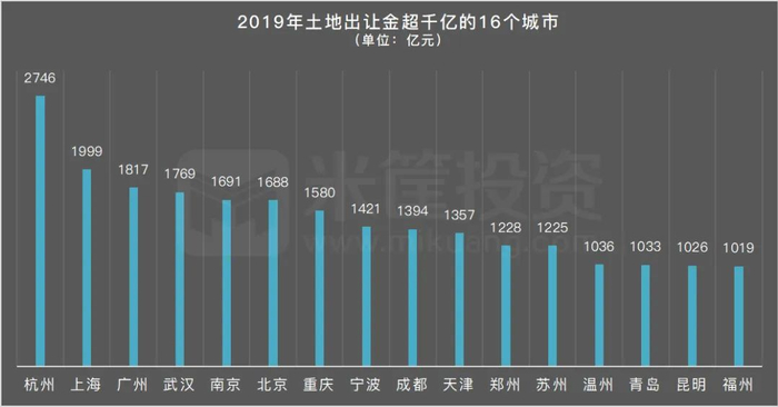 其中,有16个城市的土地出让金超过1000亿元,相比2018年新增加了6个城市。