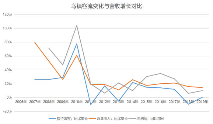 这种策略调整导致的成本提升还部分延续到了2012年,当年,乌镇景区营业收入增长率为18.95%,净利润增长率为6.31%,净利润增长首次低于营业收入增长。