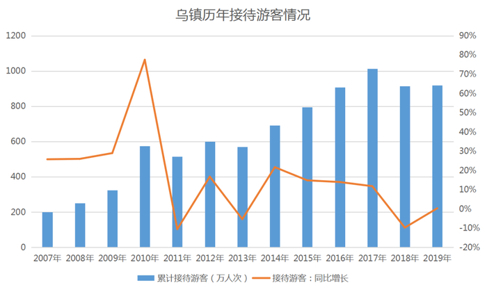这两次节点后,乌镇的接待游客人次与营收、利润都有了较大提升。到2016年,乌镇累计接待游客首次突破900万人次。此后,除2017年接待游客超1000万人次外,均维持在900-1000万人次之间。