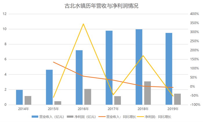 2014年,古北水镇开启对外营业。至2019年,古北水镇全年营收9.50亿元,接待游客239.37万人次。