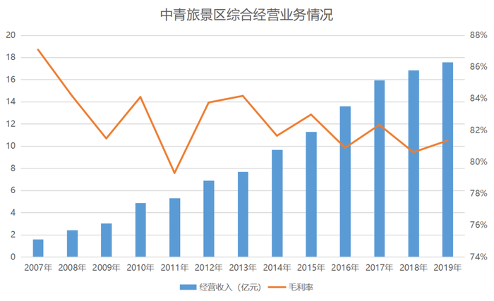 这些年由于持续投入成本的提升,中青旅景区业务毛利率有所下降,却依旧未跌出80%,景区综合经营业务收入在2019年也上升到了17.57亿元。