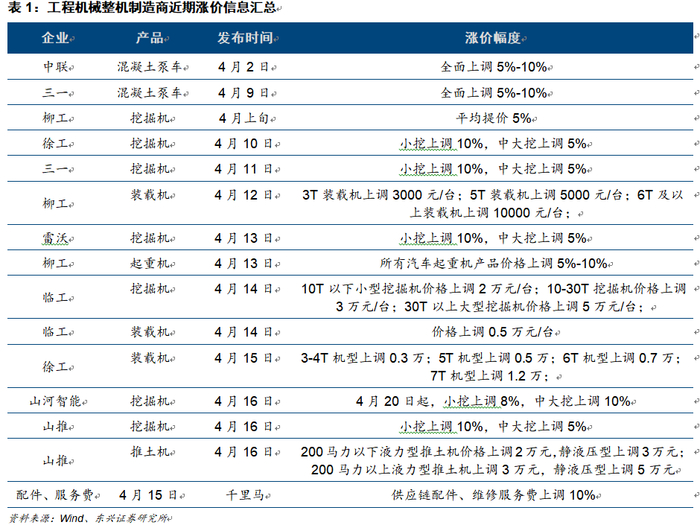 4月份以来多个品牌的挖掘机、装载机、起重机、混凝土泵车、配件和维修费均有不同程度的上涨。我们认为,这一方面由疫情冲击带来的零部件成本上升驱动,另一方面也反应了需求旺季形势下的供需再平衡。