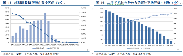 我们前期报告得出结论,开机小时数在10000-12000小时区间,挖掘机在二手交易市场将快速丧失交易价值,这也就意味着外资品牌的挖机有相当部分已进入更新淘汰阶段。