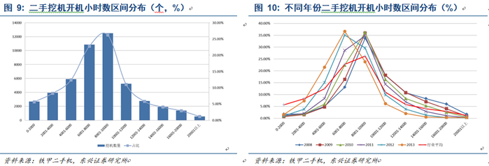 此外,2012年及之后的挖机开机小时区间集中在6001-8000个小时,意味着2012年之后的挖机尚未进入大规模更新淘汰阶段。