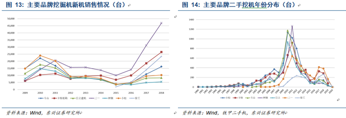 从挖机主要品牌新机销量和二手机数量来看,外资品牌在上轮周期中新机销量和二手机存量较多。2016年以来,三一、徐工新机销售快速崛起,由于机龄较新,尚未大规模进入二手机市场。