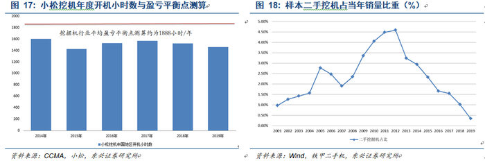 我们按照2018年挖机结构占比情况(小挖占比58.17%、中挖占比27.04%、大挖占比14.79%)进行测算,得出挖掘机行业平均盈亏平衡点在开机小时数1888小时/年。2014年以来,小松开机小时数在1400个/年-1600个/年左右波动,均低于行业平均盈亏平衡点。我们认为,挖掘机保有量持续提升,吨位小型化,存量挖机机龄老化,以及施工条件趋严等因素降低了行业平均的施工强度。挖掘机作为生产资料,业主的核心诉求在于用其创造利润,需要在购置后维持较高的使用强度。由于不同项目施工强度很难在长时间保持高强度,导致挖机向盈利性更强的业主流动,我们认为这也是挖掘机的二手交易市场较为活跃的重要原因。