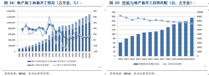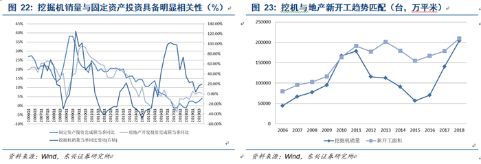 从2008年至今的两轮周期观察来看,挖掘机波动与制造业投资、基建投资总规模的相关性有所减弱,与地产投资,尤其是地产新开工和施工面积仍保持高度相关性。