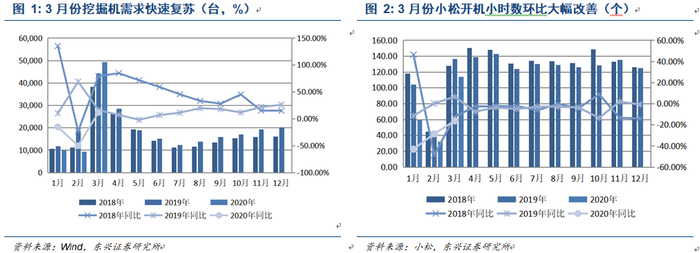 随着下游复产复工顺利推进,挖掘机主机厂和零部件厂商重拾信心。根据小松公布的中国地区挖掘机开机小时数,3月份中国地区挖掘机开机小时数达到114个,环比1-2月份(分别为59.1个小时、32个小时)大幅改善。