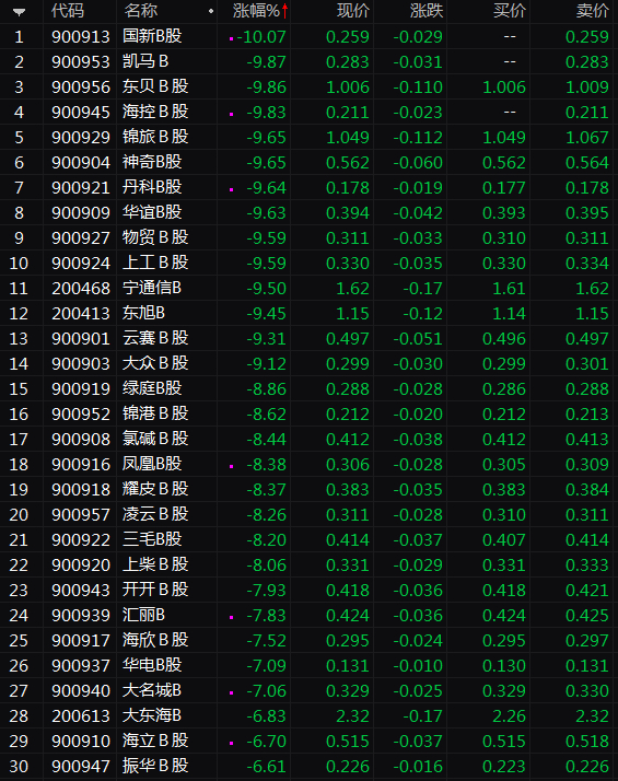 二是可能与退市规则有关。5月10日,东沣B公告称,公司股票已连续20个交易日收盘价格均低于每股1元人民币面值。根据有关规定,公司股票自11日开市起停牌,深交所将自公司股票停牌起十五个交易日内作出公司股票是否终止上市的决定。这意味着东沣B将成为第一只面值退市的纯B股。早在2018年,东沣B就曾收盘价跌破面值,后来通过回购股份、股东增持等一系列手段,退市警报才得以解除。从今天盘面的情况来看,跌幅居前的股票,也有很多是价格超低的股票。