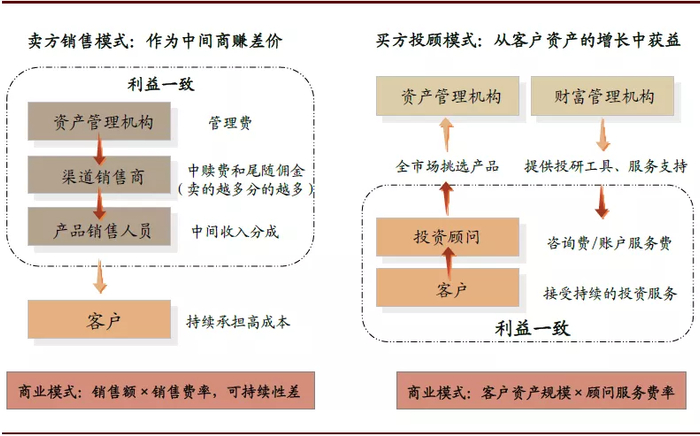 买方投顾和卖方投顾的核心区别在客户经理或投顾向谁收费。向谁收费,投顾就代表谁的利益。假如市场6000点的时候,客户要买1000万基金,但投顾明知道是在高点,他卖还是不卖呢?这个时候,如果投顾拿的是产品销售费用,只有卖基金才能完成KPI,逻辑上他会卖。但如果按年收客户投资咨询费,答案就是否定的。