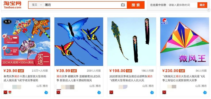 在各种电商平台上你甚至不用输入「风筝」,而是直接搜索「潍坊」,就会跳出一整个页面的风筝产品。