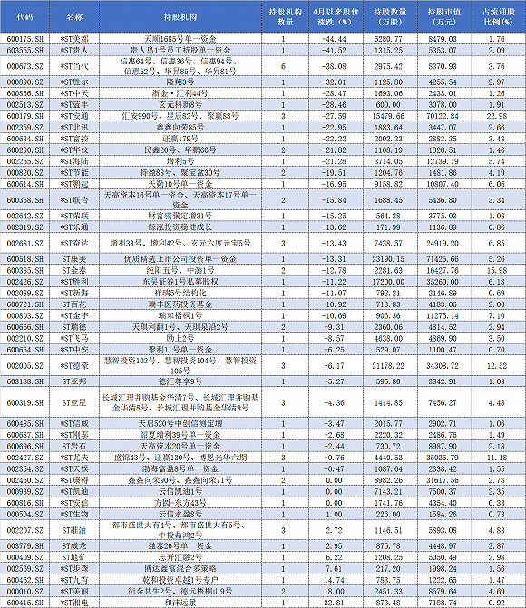 在今年一季报时新进ST股前十大流通股东之列的还有“和沣远景”、“瑞丰医药投资基金”以及“浙金•汇利44号”,各自持有的个股分别是*ST湘电、*ST百花、*ST中天等。