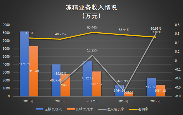 在这样的情况下,天山生物的冻精销售额逐年下降,到2019年时仅剩2356.57万元,毛利率53.01%。