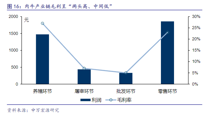 我国的牛养殖行业中小型养殖户占大多数,其分布分散、养殖规模小。据中国肉牛协会的统计数据,2016年我国年出栏量500头以上的养殖户出栏量占比仅为8%,低于生猪养殖的规模化程度。下游的屠宰端前10大企业的产量占比不足20%,而在牛肉出口大国澳大利亚、新西兰、巴西等国,屠宰环节的CR10均为60%~70%。