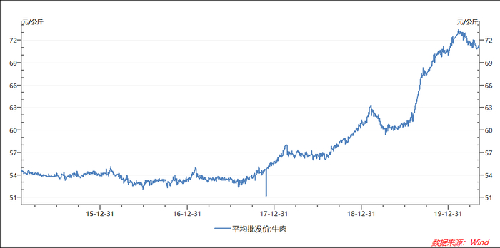 以天山生物的行业地位来看,这样的经营数据着实让人难以接受,毕竟近年来国内的牛肉价格一路高升。如下图所示,农业部披露的国内牛肉平均批发价格从2015年初的54.77元/公斤,已经上涨至如今的72.06元/公斤,仅2019年一年内的涨幅就高达14.9%。