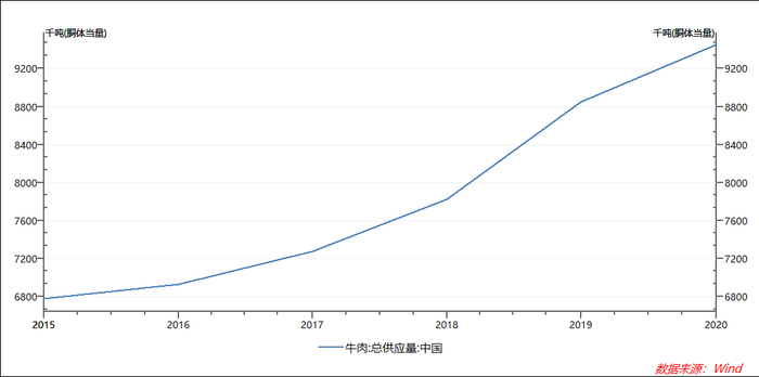 据美国农业部的测算,我国的牛肉年总供应量从2015年的6782千吨,预计将在2020年增长至9450千吨,复合增速达5.68%。同时,我国牛肉的人均消费仅为5.2千克,远低于世界平均水平,还有巨大的增长空间。