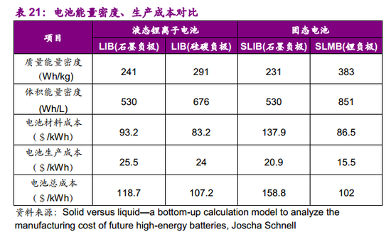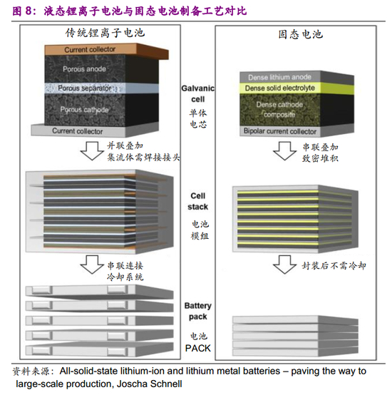 (3)固态电池可简化封装、冷却系统,电芯内部为串联结构,在有限空间内进一步缩减电池重量,体积能量密度较液态锂离子电池(石墨负极)可提升70%以上。液态锂离子电池以并联结构相接,封装复杂且体积庞大;固态电池无漏液风险,可简化冷却系统,电池以多电芯串联结构相接,优化电池封装,电池的体积能量密度大幅提升。