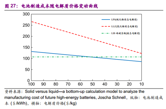 目前市场还没有固态电解质产品,如果技术问题得到解决,硫化物固态电解质降本至约50$/kg后价格将优于锂离子电池。采用双极堆叠法封装电池,当生产成本从100$/kg降至10$/kg,硫化物固态电池SLMB制造成本从132$/kg到86$/kg,降低35%,与LIB相比价格具有竞争力。