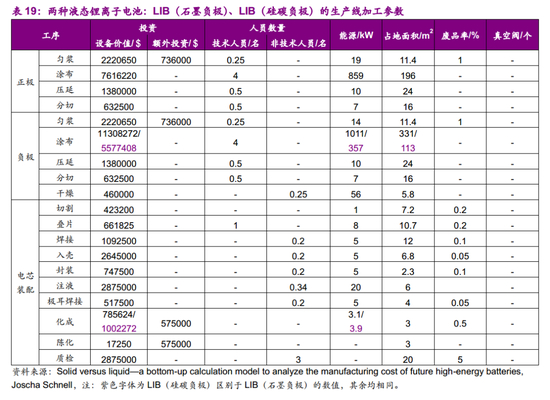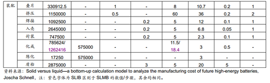 为研究生产成本,假设工厂年产能6GWh,由于各类电池能量不同,电芯年产量也有所差异,液态锂离子电池LIB(石墨负极)、液态锂离子电池LIB(硅碳负极)、固态电池SLIB和固态电池SLMB分别为3170万只、2490万只、3170万只、1970万只。