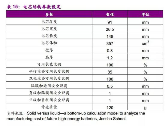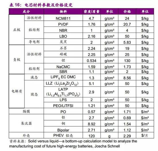 测算只考虑电芯组装的成本,不涉及电池包pack环节。电芯成本包括材料成本和加工成本(人工、折旧、利息、能源、维护和工厂面积成本等)。