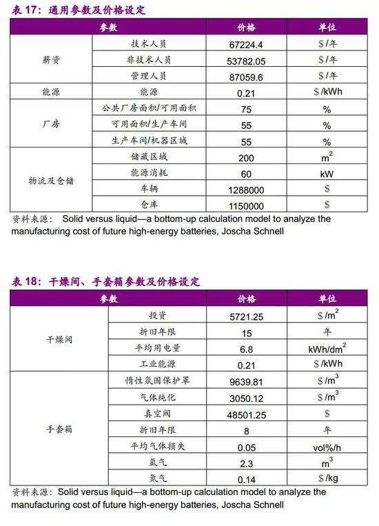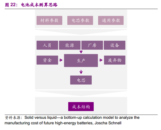 固态电池要想与传统液态锂离子电池一较高下,电池降本至关重要。近两年内固态电池生产线迎来一轮不小的投产潮,清陶、卫蓝新能源、辉能科技等企业将建固态电池生产线,虽然目前各企业均未公布固态电池成本,但此前已有预测固态电池成本远高于锂离子电池,未来固态电池若想实现产业化,降本则成必然。为定量研究固态电池成本,参考Joscha Schnell的文献,依据研究成果、专家访谈和供应商报价,结合电池性能和成本,设定具体的参数,建立自下而上的计算模型。