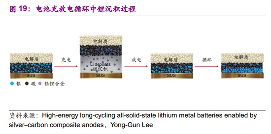 三星固态电池最新科研成果发布,全固态电池性能出现重大突破。2020年3月初,三星高等研究院(SAIT)与三星日本研究中心(SRJ)在《自然-能源》(Nature Energy)杂志上发表《High-energy long-cycling all-solid-state lithium metal batteries enabled by silver–carbon composite anodes》,介绍了其在固态电池领域的最新进展,银碳基全固态电池能够实现900Wh/L高能量密度、1000圈以上长循环寿命及99.8%极高库伦效率(充放电效率),电池一次充电后可驱动汽车行驶800公里。