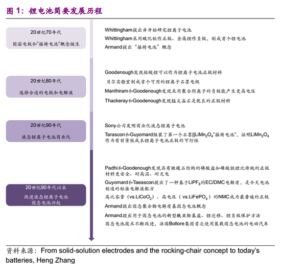 1991年索尼公司推出商业化液态锂离子电池,随后液态锂离子电池进入快速发展阶段。由于对更高能量密度和更高安全性电池的追求,固态电池重新引起了人们的关注。20世纪90年代,Armand先后提出Li+迁移原理、锂负极保护等理论,固态电池不断得到改进,2011年Bollore集团首次使用装载固态电池的电动汽车,证明了固态电池应用的可行性。