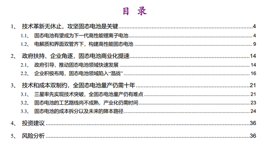 我们认为,向全固态锂电池过渡是锂电技术进步的重要趋势;目前,全球都在加快固态电池的研发,虽然距离产业化尚需时间,但如电解质或负极材料选择与改性、电池工艺革新都应是一步一步探索的过程;我们建议持续关注企业与科研单位的创新技术成果的发布、并持续关注龙头公司的锂电产品的研发进展。