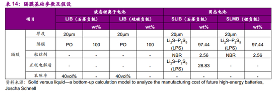 (3)液态锂离子电池LIB电池的隔膜制造成本在9.6-10.3$/kWh,固态电池SLIB和SLMB隔膜成本略高于LIB,分别在14.1$/kWh和13.6$/kWh;