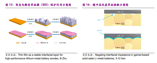 界面接触差、锂枝晶也是困扰锂负极应用的难题。固态电解质只能在一定程度上抑制锂枝晶的生长并防止其穿透造成电池短路,对界面进行改性或制备一层固态电解质界面膜(SEI)能有效削弱锂枝晶的影响。引入缓冲层填补界面间的空隙,可以改善界面接触,同时避免界面反应的发生。