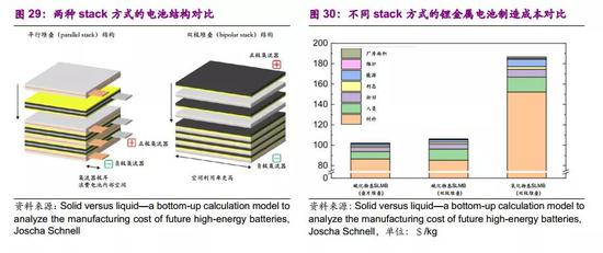 电芯stack工艺改进,双极堆叠法生产的硫化物固态电池,成本比平行堆叠法高4.1%,而体积能量密度提升了17.6%,双极堆叠法性价比更高。双极堆叠法能节省电池空间,同一电池内填放电芯数更多,基本的固态电池SLMB电池包含141个串联的电芯,平均放电电压536V,双极堆叠法制造电池的成本比平行堆叠法高4.1%,而体积能量密度提升了17.6%。