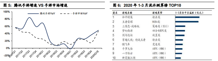 从历史数据来看,自2017Q1以来,受游戏版号限制发放政策影响,腾讯手游仅在2018下半年及2019Q1跑输行业增速,2020Q1,手游市场同比增速约47%。