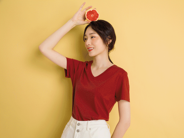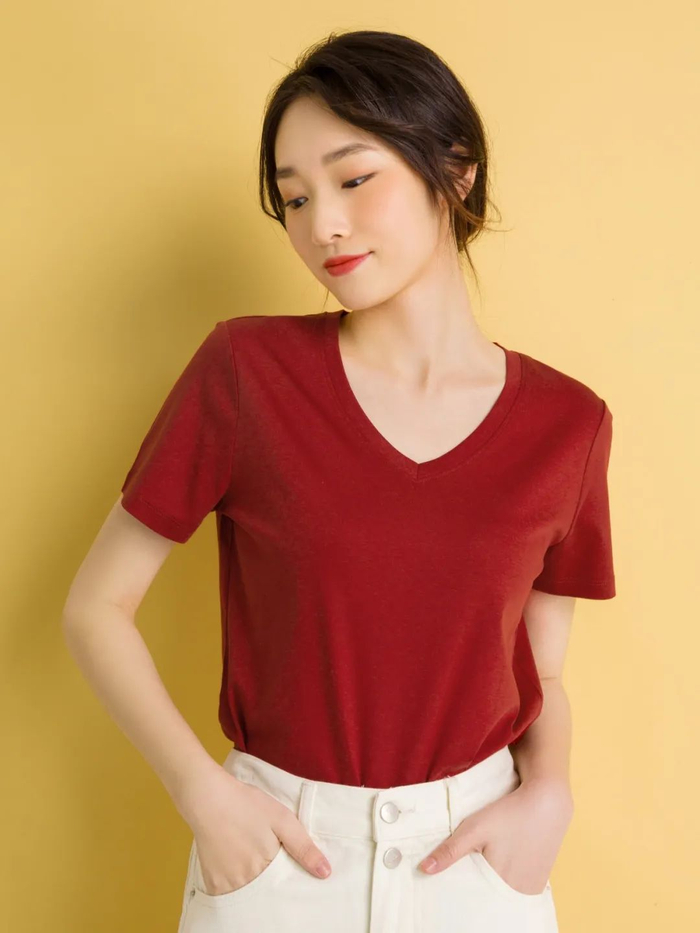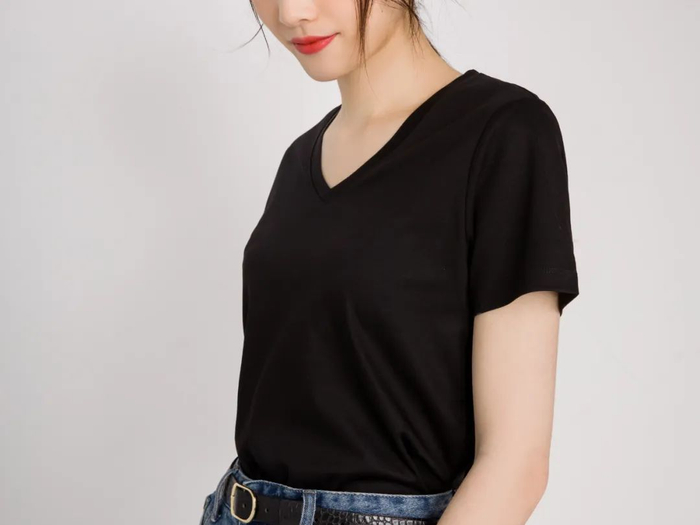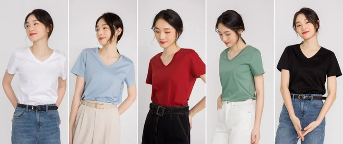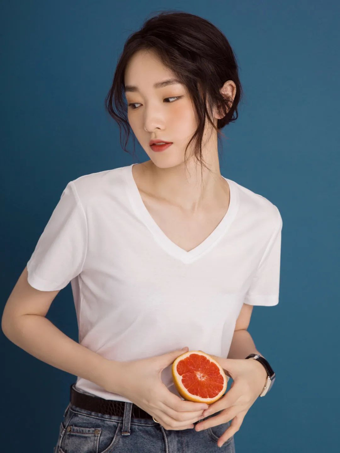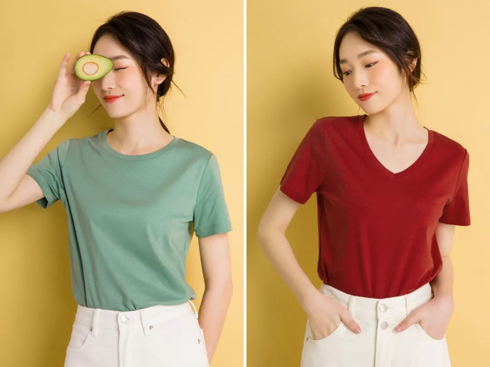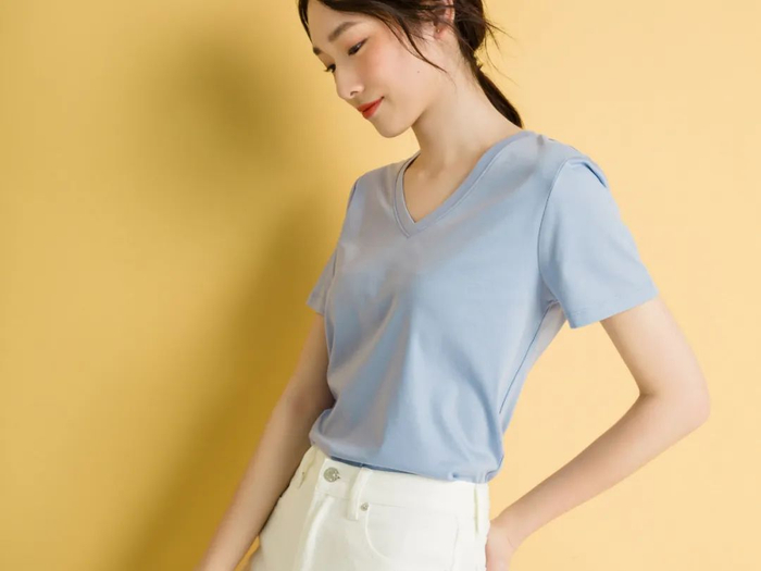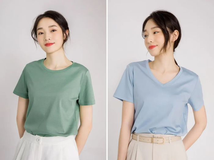 两款T恤只在领口处理上有所不同,一款小圆领,一款V领,可以按需选择。