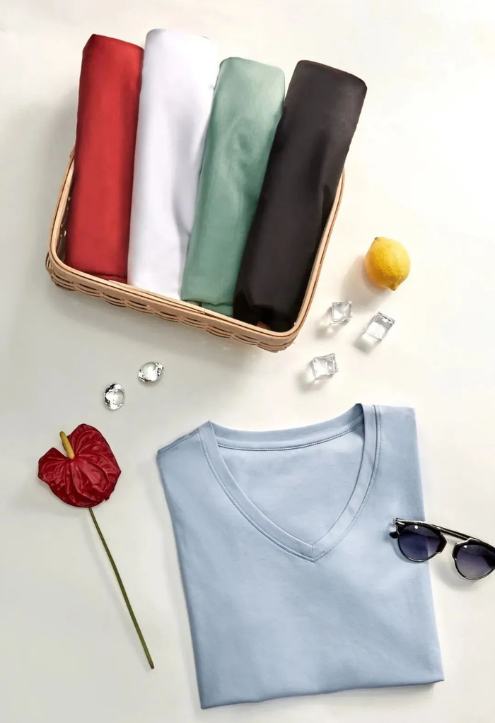 让T恤同时具备了桑蚕丝的光滑,丝光棉的透气和淡淡的光泽感,还有再生纤维素纤维的凉感。