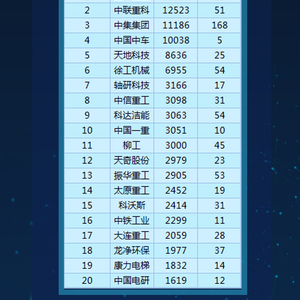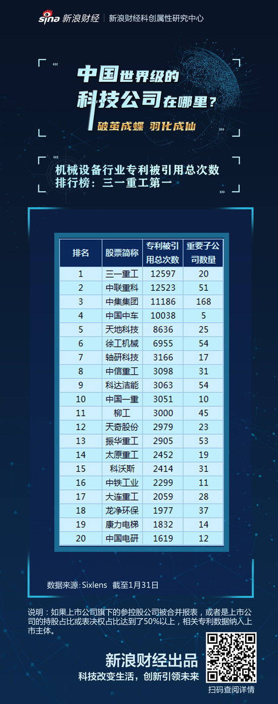 机械设备行业专利被引用总次数排行榜:三一重工第一