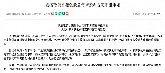 2015年6月,海南省金融办发布,小额贷款企业可直接向工商部门提出注册登记申请,无需再提交省金融办出具的前置批文,改为报备制。