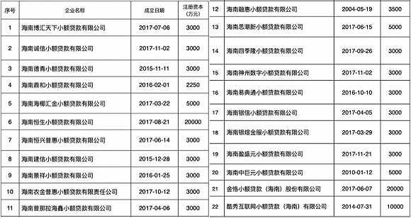 2019年8月,海南省金融办公告,全省有22家小额贷款公司取得市场监督管理部门办理的营业执照,不具备小额贷款公司试点经营资格。