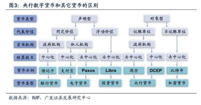 根据货币类型的不同,货币可分为对象型货币和声明型货币,央行数字货币属于对象型货币。近年来随着比特币等各类新型货币的诞生,IMF提供了一个新的货币分类框架来理解分析各类货币的异同。央行法定数字货币的DC/EP,其实质是对现金的替代,所以可视为对象型货币。