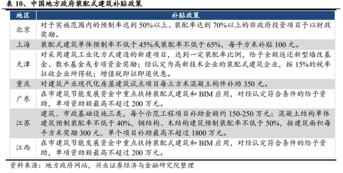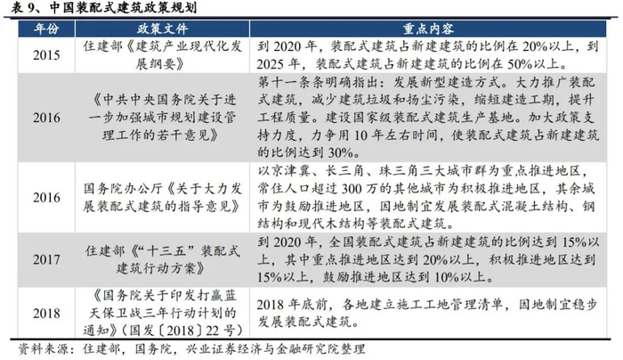 2016-2017年,国务院和住建部相继颁布政策文件,对全国装配式建筑占新建建筑的比例提出要求:到2020年达到15%以上,到2025年达到30%。在地区推进层面,国务院办公厅和住建部要求,以京津冀、长三角、珠三角三大城市群为重点推进地区,到2020年装配式建筑占比达到20%以上;常住人口超过300万的其他城市为积极推进地区,占比达到15%以上;其余城市为鼓励推进地区,占比达到10%以上。为促进装配式建筑发展,部分地方政府针对符合特定要求的装配式建筑也提出了补贴政策。