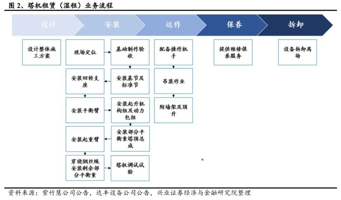 在塔机租赁过程中,塔机租赁商负责设备从安装到拆卸离场的所有环节。塔机租赁商通常通过招投标方式取得经营合同,签订合同后,塔机租赁商根据施工环境需要设计整体施工方案,随后开始塔机设备安装服务(包括现场定位,安装基节及标准节、回转支座、平衡臂、起升机构组及动力包组、部分平衡重塔顶总成、起重臂、钢丝绳等),待设备安装完毕,塔机租赁商提供配备操作机手进行高空作业,出现质量问题则相应提供维修服务,到设备使用完毕,塔机租赁商继续负责设备拆卸离场。