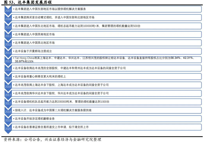 2006年前后,中国房地产业快速发展,达丰控股将目光投向中国塔机租赁市场。当时中国塔机租赁市场刚刚起步,竞争格局高度分散,达丰控股计划凭借其资金规模和专业能力的优势,在中国塔机租赁市场中取得领先地位。2007年1月,达丰控股与当时中国最大的塔机租赁商北京中建正和工程机械有限公司共同成立战略合资企业,正式进入中国塔机租赁市场。2014年,达丰设备服务有限公司(简称“达丰设备”)在开曼群岛正式成立,旨在成为达丰控股在中国主要附属公司的投资控股公司。达丰设备专注于提供塔机解决方案服务,是在中国成立的首家外资塔机服务提供商。2018年,达丰设备实现营业收入6.56亿元,净利润0.68亿元,总资产19.49亿元,按照收入口径,市场占有率达到0.7%,位居全国第二。根据国际起重设备和特种运输杂志《International Cranes and Specialized Transport》(2019年9月刊)“2019年塔式起重机吨米指数”(IC Tower Index 2019)排名,达丰设备管理的塔机总吨米数达到242584吨*米,位居世界第五位。2019年,达丰设备开始涉足塔机翻修业务,计划在扬州成立维修中心,作为华东地区的集中塔机中心。2020年1月,达丰设备在香港证券交易所递交上市申请,拟于港交所上市。
