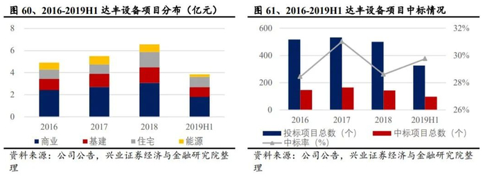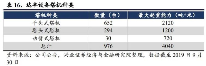 达丰设备的塔机租赁业务,下游主要包括商业、基建、住宅及能源行业的EPC项目。截至2018年年底,达丰设备参与了中国50%以上的核电项目以及约60%的LNG项目。截至2020年1月5日,达丰设备已完成716个项目;其中,基建项目168个,能源项目73个,商业项目327个,住宅项目148个,中标率达36%。