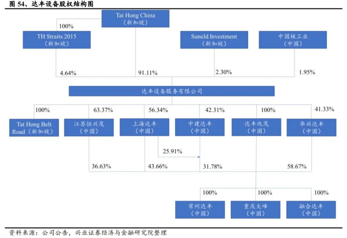 截至2020年1月5日,达丰设备的控股股东为Tat Hong China,后者直接持股比例91.11%,是达丰控股在中国附属公司的投资控股平台。达丰设备附属公司包括在中国成立的达丰兆茂、江苏恒兴茂、上海达丰、华兴达丰、中建达丰、常州达丰、重庆大峰和融合达丰,以及在新加坡成立的Tat Hong Belt Road。其中,达丰兆茂为常州达丰、重庆大峰、融合达丰的境内控股平台,江苏恒兴茂为达丰设备集中内部租赁实体,管理所有塔机和零件的采购,上海达丰在提供塔机租赁服务的同时还负责为达丰设备各子公司提供后勤服务,融合达丰提供塔机翻修和装配服务,其他子公司从事塔机租赁业务。
