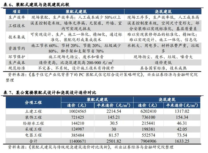 装配式建筑是一种高集成化程度的住宅,相比于浇筑建筑,在耗水、耗能、人工、环保、施工效率等方面具备更优越的性能。但当前装配式建筑的造价比浇筑建筑高200-900元/m2,原因是装配式建筑采用叠合楼板和叠合梁,这种叠合构件的厚度要比一般构件厚30-50%。此外,装配式建筑的规范标准还不完善、不系统,设计施工的技术也有待提升,装配式建筑的发展仍有较大空间。