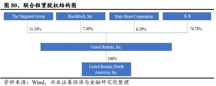美国联合租赁的前三大股东均为基金管理公司。其中,第一大股东为The Vanguard Group,持股比例为11.34%。美国联合租赁为控股公司,其旗下仅有United Rentals (North America), Inc.一家全资子公司,并通过子公司开展业务,无其他参股或控股公司。
