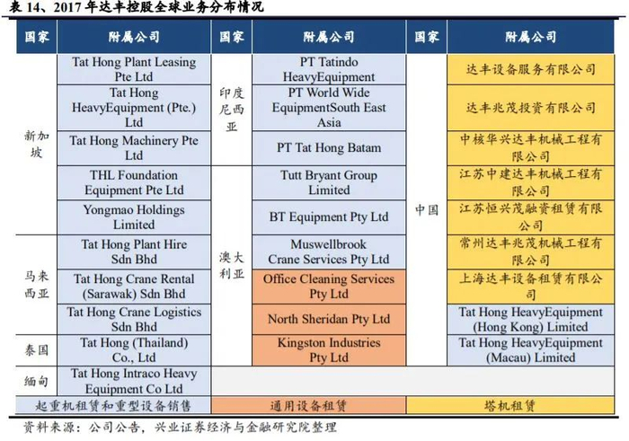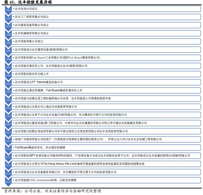 20世纪80年代,达丰集团在新加坡和马来半岛从事设备租赁业务,重型设备的租赁和销售成为集团的核心业务。1991年达丰控股(TAT Hong Holdings)成立,达丰集团业务全部归入达丰控股旗下。2000年,达丰控股在新加坡证券交易所主板上市。2018年,THSC Investments公司收购达丰控股,达丰控股从新交所摘牌退市。THSC Investments公司的股东为Augusta Investments Zero(新加坡)和TH60 Investments(新加坡),持股比例分别为29.20%和70.80%。其中TH60 Investments的股东为达丰控股CEO黄山忠先生的家族。私有化退市后,达丰控股的管理层决策更加灵活。目前,达丰控股主要从事工程起重机租赁、塔机租赁、通用设备租赁,以及重型设备、起重机及相关零配件的销售和售后服务业务。以起重机保有量计算,达丰控股是亚太地区最大的起重机租赁商。