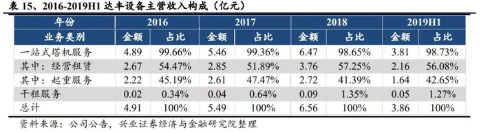 达丰设备的核心业务为一站式塔机服务,2018年,该部分业务收入占总收入的比重为98.65%。同时,一站式塔机服务可分为两类细分业务:经营租赁和起重服务。经营租赁指按照项目服务合约在客户项目场地配置并安置塔机,起重服务则指提供塔机解决方案的服务,2018年收入占比分别为57.25%和41.39%。