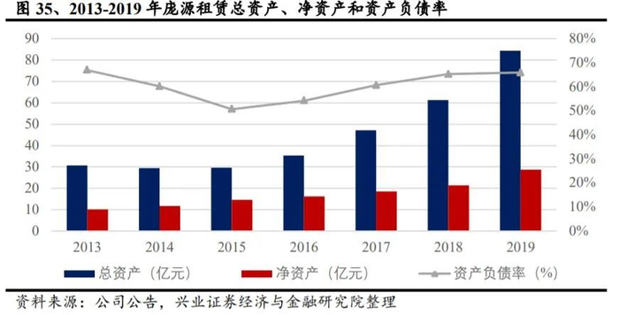 由于塔机单价较高,租赁商在采购的时候通常采用融资租赁的方式。2013-2019年,庞源租赁资产负债率始终在50%以上。2015年起,庞源租赁资产负债率持续提升,到2019年达到65.91%,与公司扩大经营规模,大幅增加资本开支有关。