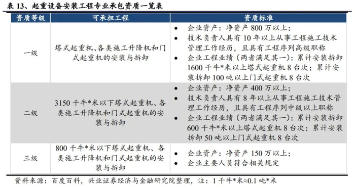 塔机租赁商需具备国家认定的起重设备安装工程专业承包资质,该资质按照等级划分可分为一级、二级和三级。其中,一级资质可承包各类塔机安装,二级资质只能承包3150千牛*米以下塔机安装,三级资质只能承包800千牛*米以下塔机安装。这意味着只有具有一级、二级承包资质的企业才具备装配式建筑的承包资质,从而有利于头部租赁商的发展。